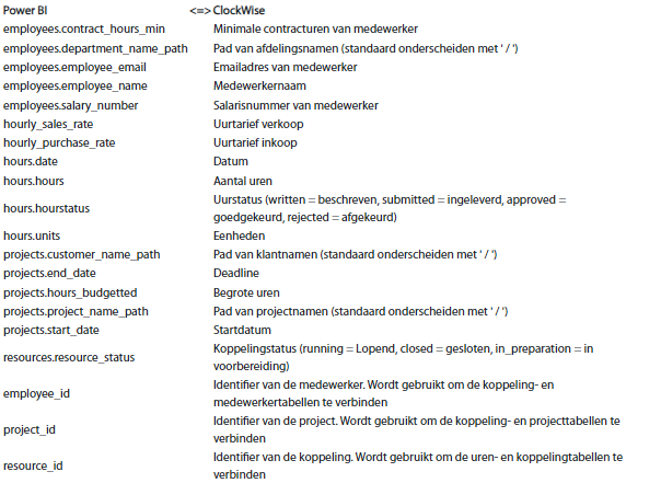 De volgende tabel geeft een vertaling van de meest gebruikte veldnamen in Power BI naar die in ClockWise.